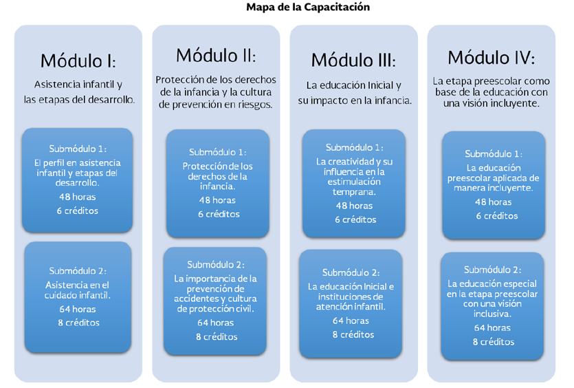 Esta capacitación para el trabajo brinda habilidades y destrezas para el cuidado infantil, así como en la educación preescolar mediante la revisión de protocolos, programas o lineamientos que le permitan atender de manera responsable, creativa e incluyente a la infancia, con la finalidad de fomentar un compartimiento ético y empático en su vida cotidiana.