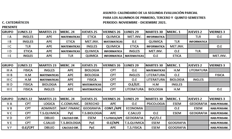 Calendarización correspondiente a la segunda evaluación, periodo Noviembre - Diciembre 2021 para los alumnos de primero, tercero y quinto semestre.