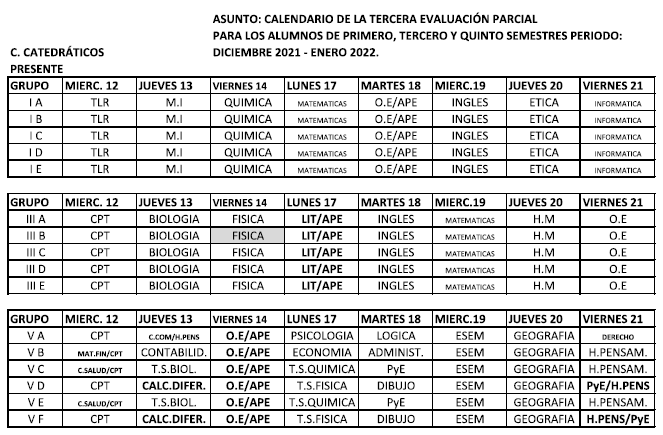 Calendarización correspondiente a la tercera evaluación, periodo Diciembre 2021 - Enero 2022 para los alumnos de primero, tercero y quinto semestre.